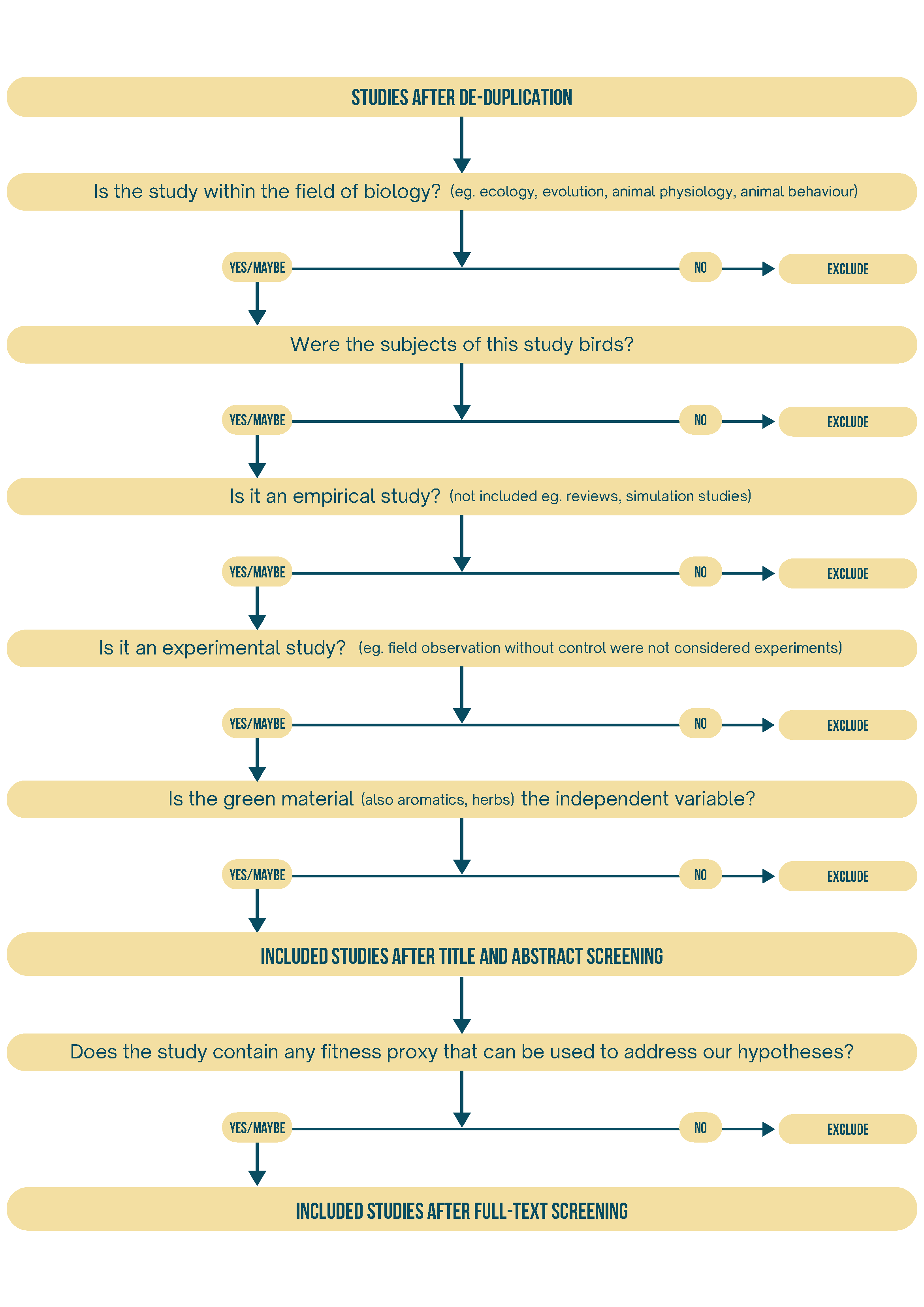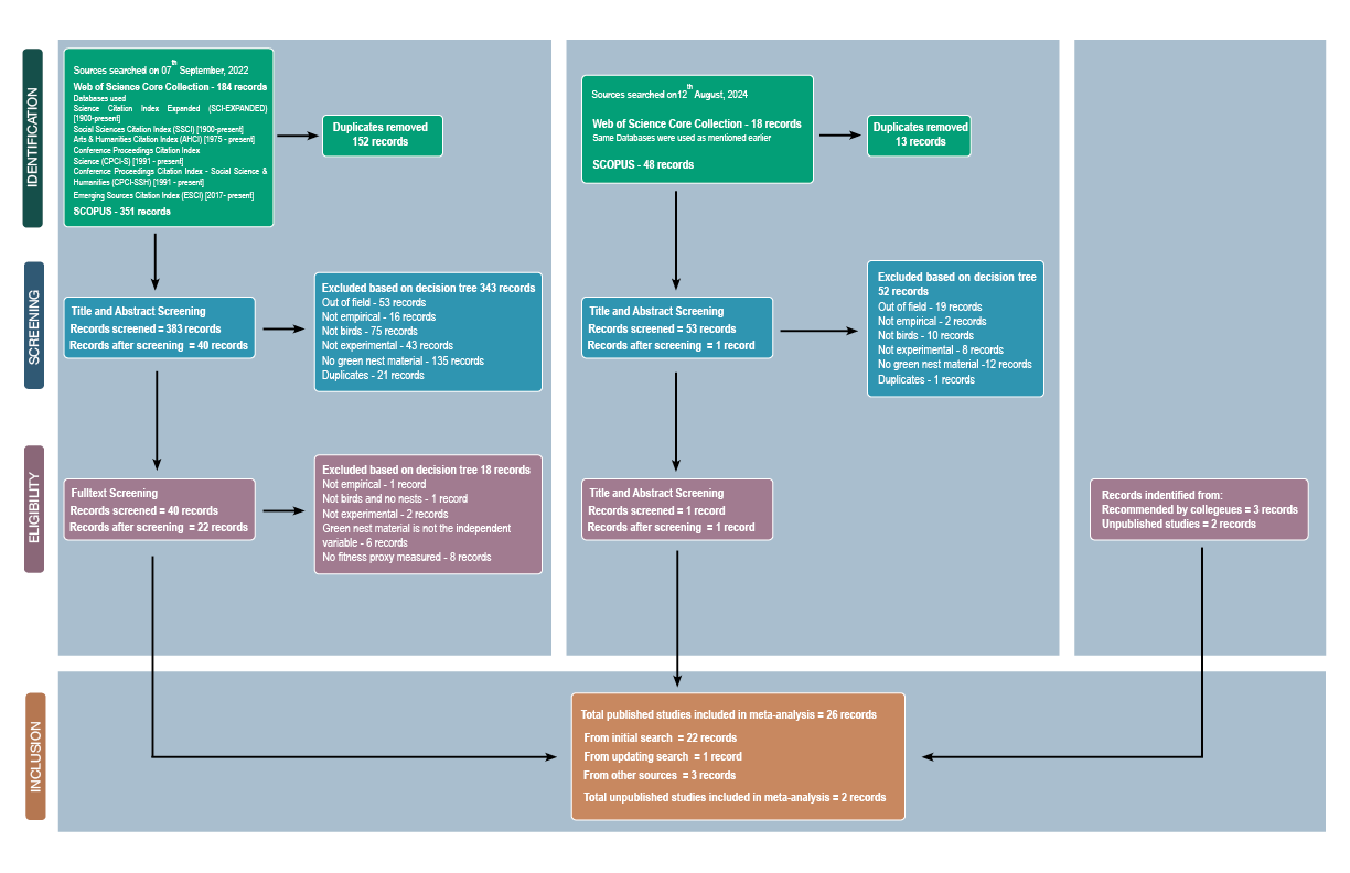 We conducted a systematic search on Web of Science Core Collection and Scopus on the 7th of September, 2022 (see update below). The keyword search query was designed as a three-block query including terms related to our treatment of interest ((“green*” OR “herb*” OR “aromatic*”) AND “nest*”), population of interest (“bird*” OR “aves” OR “avian” OR “ornithol*” OR “passerine*” OR “passeriform*” OR “songbird*” OR list of all bird genera) and to limit the search results to experimental studies only (“experiment*” OR “manipulat*”). The complete search strings tailored to each specific platform are provided in Figure S16. Although our search string only included keywords in English, we planned to screen any study in English, Spanish, Portuguese and Hindi, but found studies only in English. We searched through titles, abstracts and keywords with no restrictions on publication date or study type. We validated our search using an initial library of 15 relevant articles that we had previously identified (Figure S2), ensuring all were retrieved. Additionally, we used the R package ‘litsearchr’ v1.0.0 (Grames et al. 2019), which did not yield any new relevant terms, confirming our queries. After removing 152 duplicates using the R package ‘revtools’ v0.4.1 (Westgate 2019), we identified 383 unique records.