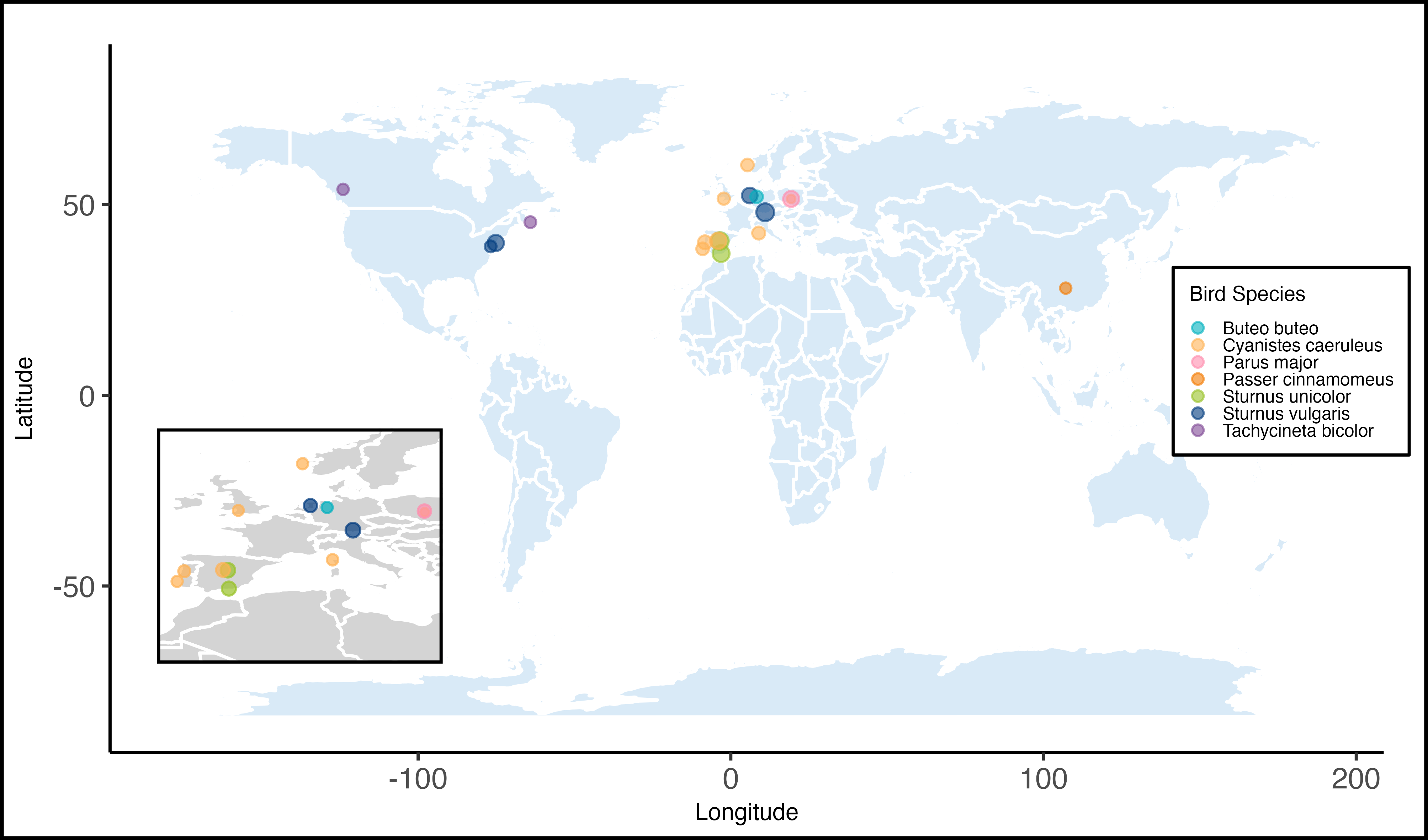 We obtained 274 effect sizes from a total of 28 studies conducted on 7 species across 17 geographical locations (Figure1). About 81% of the effect sizes came from only three bird species (Cyanistes caeruleus, k = 77; Sturnus unicolor, k = 60; Sturnus vulgaris, k = 86). Our dataset included 2 unpublished studies (k = 18), with the remaining studies being published between 1988 and 2024. The mean ±standard deviation number of effect sizes per study was 9.8 ± 6.4 (median: 8.5 range: 2–24) and the mean effective sample size (i.e., the number of nests/individuals per effect size after accounting for shared-group non-independence) was 32.3 ±31.1 (median: 22.0, range: 3–210; 31 data points had a sample size of less than 5 nests in each group).
