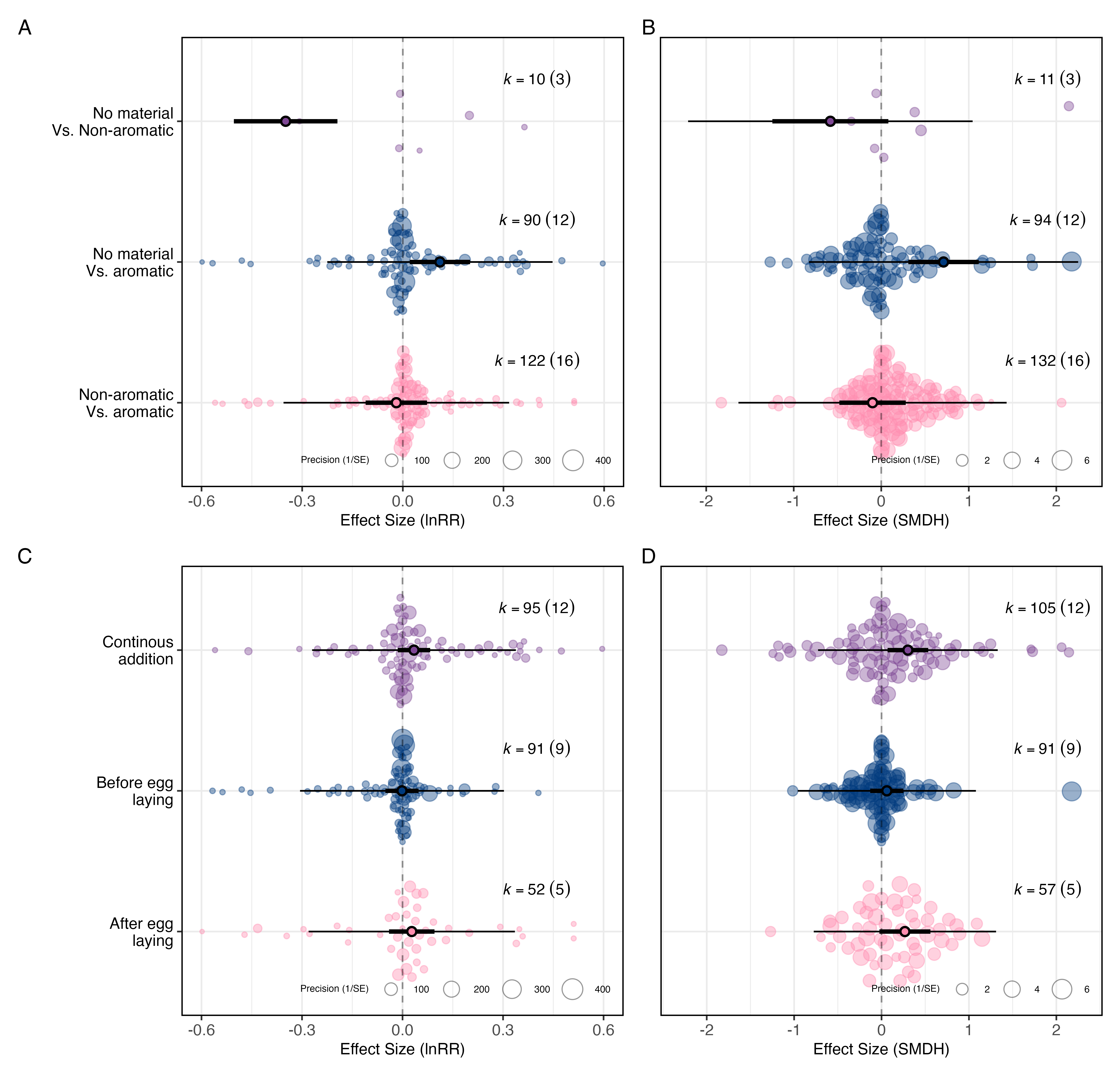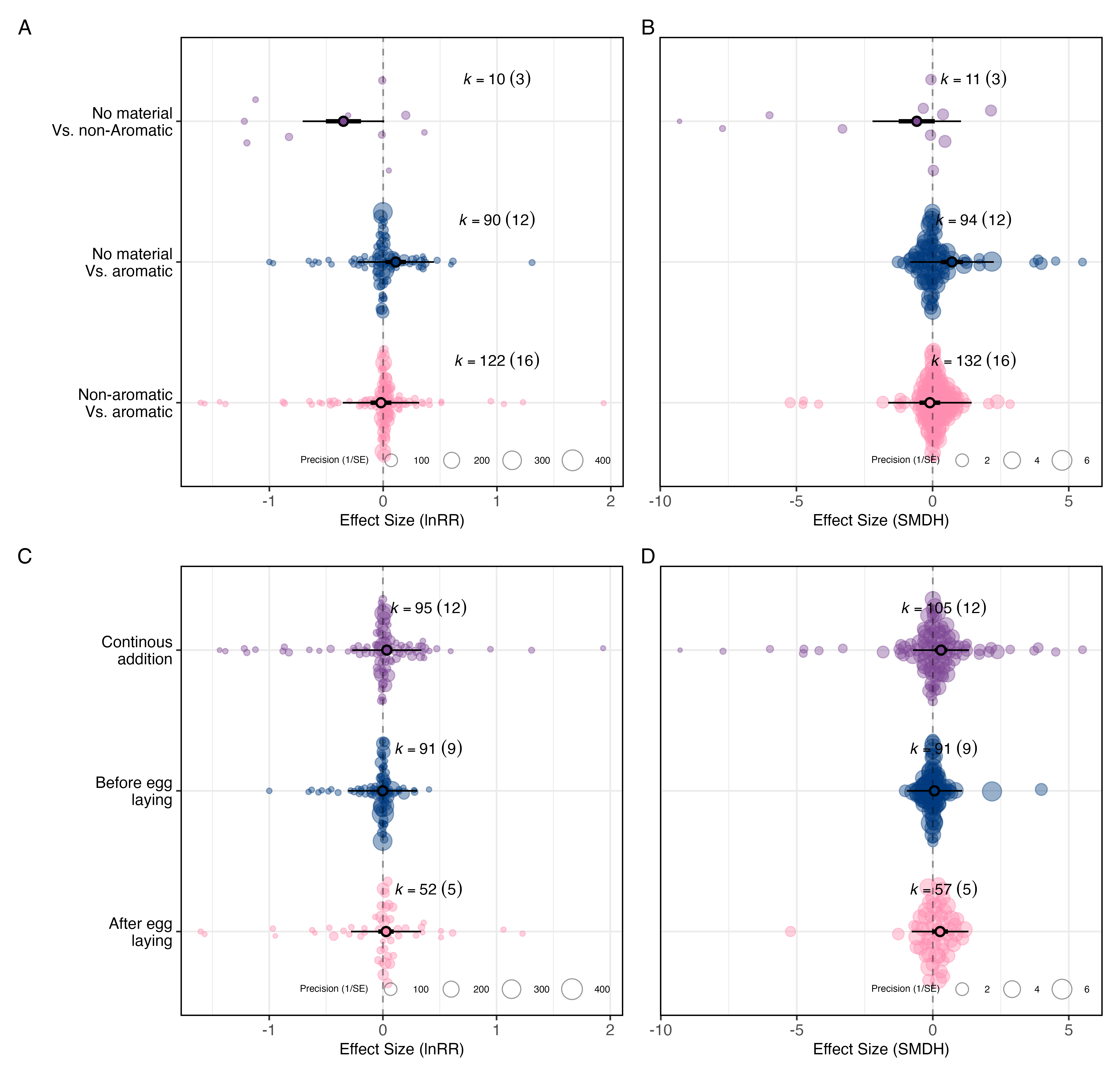 Exploratory meta-regressions: We performed additional pre-registered multilevel meta-regressions for which we did not have clear directional predictions. To understand the effect of type of experimental design (i.e., whether the authors compared non-aromatic vs. aromatic, no added material vs. aromatic, no added material vs. non-aromatic), we ran a meta-regression with the type of ‘experimental design’ as the moderator. To test the effect of time of addition of GNM on fitness (levels: before egg hatching, after egg hatching, continuously throughout the nesting phase), we ran a meta-regression with ‘time of addition of GNM’ as the moderator. We also ran a meta-regression using ‘bird species’ as the moderator (levels: Buteo buteo, Cyanistes caeruleus, Passer cinnamomeus, Parus major, Sturnus unicolor, Sturnus vulgaris, Tachycineta bicolor) to understand if and how the effect of GNM on fitness might differ among species. Furthermore, we explored the effect of GNM on fitness depending on the ‘category of fitness proxy’ studied (levels: behaviour, morphology, parasite and pathogenic load, phenology, physiology, reproduction) using a meta-regression with the fitness proxy category as the moderator. Last, for the subset focusing on parasites and pathogens (k = 90, n = 16)), we ran a meta-regression with the ‘type of parasite’ as the moderator (levels: arthropod, micro-organism).
