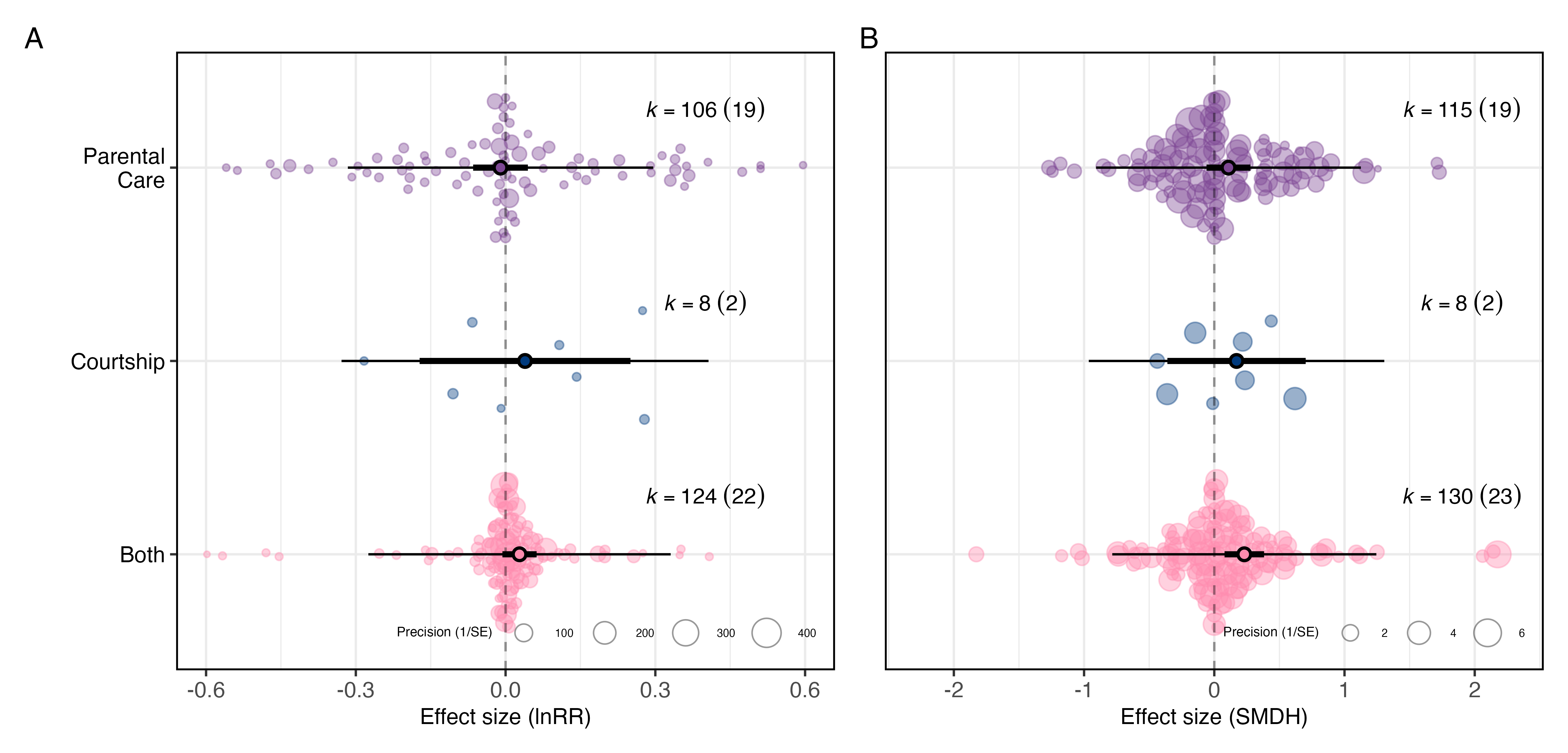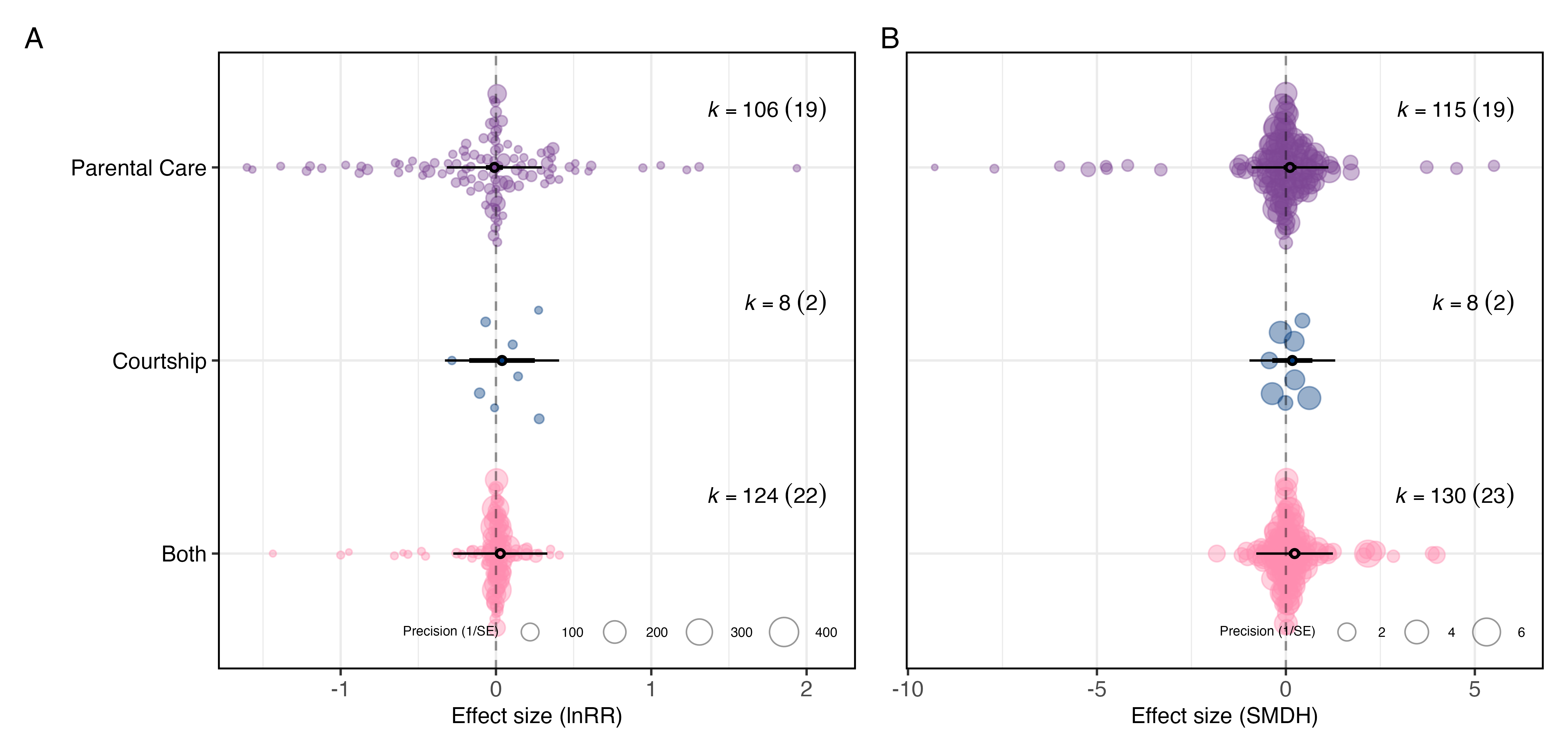 Our multilevel meta-regressions found no clear support for either of the two main hypotheses proposed in the literature (Figure3). The estimates for the courtship hypothesis (lnRRcourtship = 0.039, 95% CI: [-0.172, 0.250], 95% PI: [-0.329, 0.407], p-value = 0.716, k = 8, n = 2; SMD(H)courtship = 0.171, 95% CI: [-0.360, 0.702], 95% PI: [-0.964, 1.305], p-value = 0.527, k = 8, n = 2), and the nest protection and drug hypothesis (i.e., “parental care hypothesis”) (lnRRparental_care = -0.010, 95% CI: [-0.065, 0.045], 95% PI: [-0.316, 0.296], p-value = 0.716, k = 106, n = 19; SMD(H)parental_care = 0.109, 95% CI: [-0.060, 0.278], 95% PI: [-0.908, 1.126], p-value = 0.204, k = 115, n = 19) were statistically non-significant. However, about half of all effect sizes could not be unequivocally assigned to only one hypothesis, so our meta-regression contained a third category that combined both. This category showed an average positive increase in fitness estimates in nests with an experimental increase of GNM, but the effect was only statistically significant for SMD(H) (lnRRboth = 0.028, 95% CI: [-0.006, 0.062], 95% PI: [-0.275, 0.331], p-value = 0.110, k = 124, n = 22; SMD(H)both = 0.231, 95% CI: [ 0.079, 0.382], 95% PI: [-0.784, 1.245], p-value = 0.003, k = 130, n = 23). None of the three categories differed statistically significantly from each other (\({p-value}_{lnRR)}\) > 0.211 and \({p-value}_{SMD(H)}\) > 0.178 in all cases), and the moderator explained little heterogeneity (\(R^2_{marginal(lnRR)}\)= 1.6% and \(R^2_{marginal(SMD(H))}\)= 1.4%).