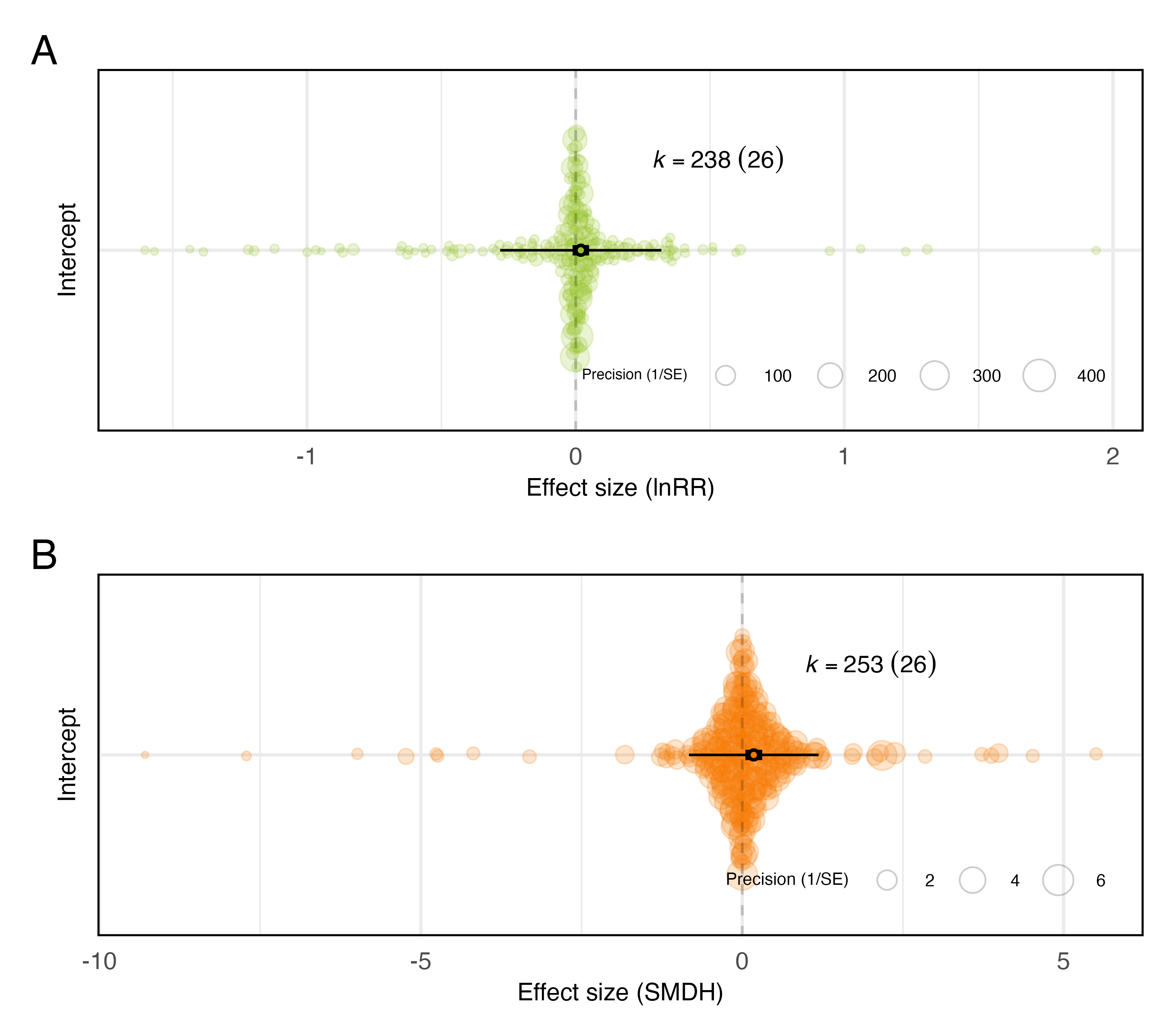 Since published effect sizes did not seem to change considerably over time, our analyses suggest no clear evidence of decline effects (i.e., time-lag bias) in published effect sizes (lnRRintercept = 0.021, 95% CI: [-0.011; 0.053], p-value = 0.196, lnRRslope = -0.002, 95% CI: [-0.005 to 0.001], p-value = 0.225, k = 221, n = 24, \(R^2_{marginal(lnRR)}\)= 1.8%; SMDHintercept = 0.193, 95% CI: [0.058 to 0.329], p-value = 0.005, SMDHslope = -0.008, 95% CI: [-0.023 to 0.006], p-value = 0.264, k = 235, n = 24, \(R^2_{marginal(SMD(H))}\) = 2.9%).