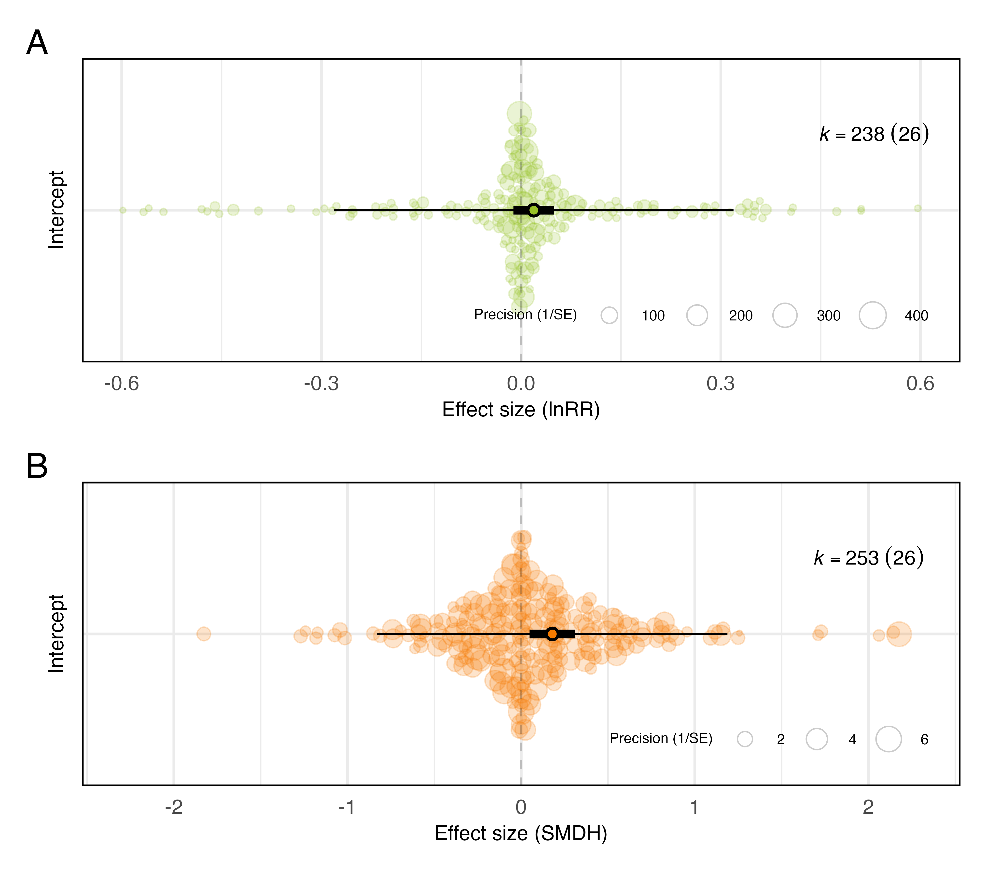 For the few cases for which we could not extract means and variances but inferential statistics such as t and F values, we estimated SMD values (k = 4, n = 2) using the equations provided by Cooper, Hedges, and Valentine (2019). For dichotomous variables (e.g., number of successful nests, k = 4, n = 2), we calculated the log odds ratio (lnOR) using the ‘escalc’ function (measure=OR) from ‘metafor’ and subsequently converted it to SMD using equations from Cooper, Hedges, and Valentine (2019). Since lnRR cannot be calculated from inferential statistics, dichotomous variables, or traits including zero or negative values (k = 7), the number of effect sizes included in the lnRR subset (k = 259, n = 28) is smaller than that of SMDH (k = 274, n = 28).