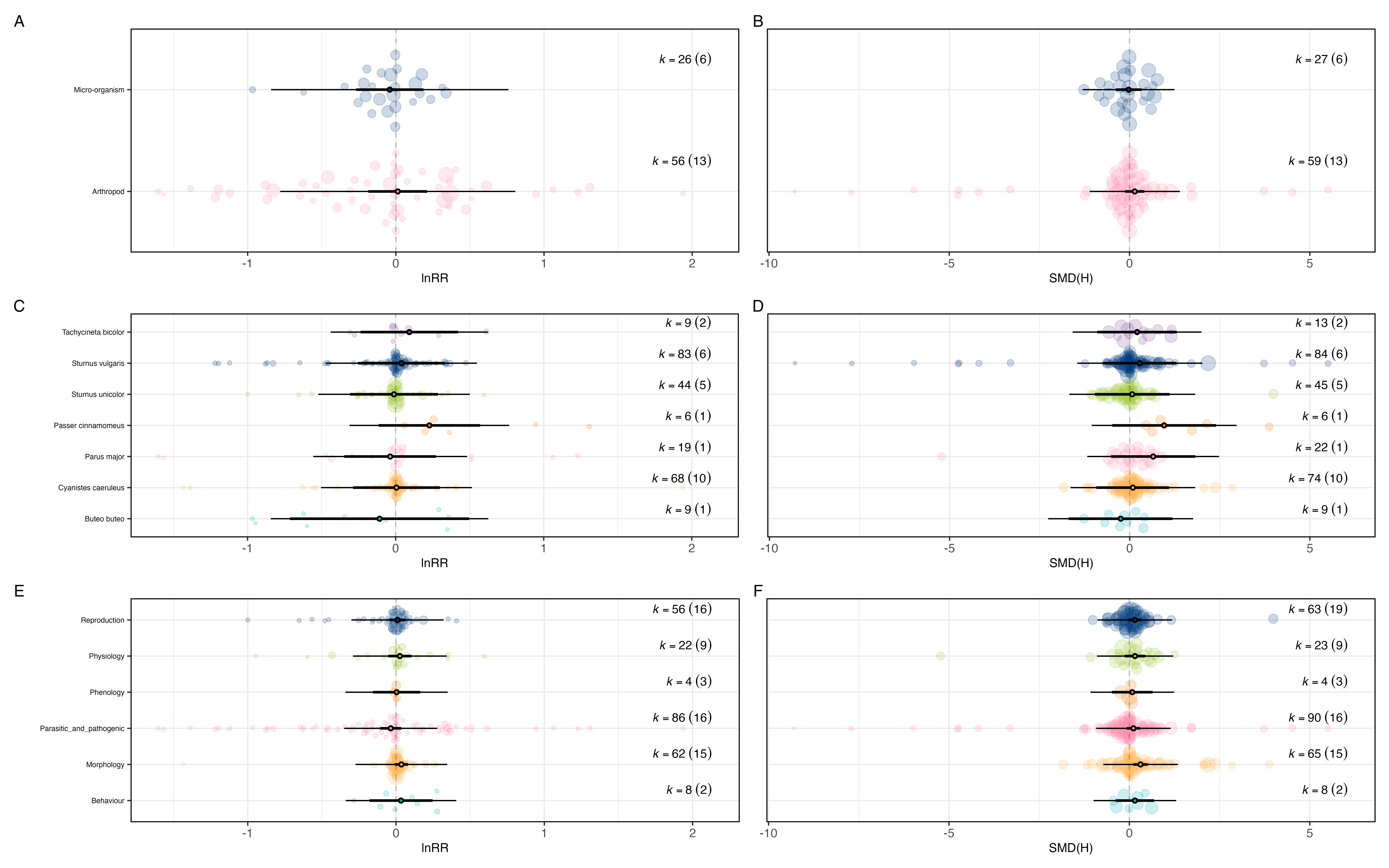 Third, although none of the species-specific mean estimates were statistically significant, most were positive Figure S14, Table1, and bird species identity explained a non-negligible amount of heterogeneity (\(R^2_{marginal(lnRR)}\)= 5.3% and \(R^2_{marginal(SMDH)}\)= 8.5%). Fourth, most fitness proxy-specific mean estimates were positive, but only morphology was statistically significant, and only for SMD(H) (SMDHmorphology = 0.310, 95% CI: [ 0.112, 0.509], 95% PI: [-0.723, 1.343], p-value = 0.002, k = 65, n = 15; Figure S14; Table1) and fitness proxy category accounted for a small amount of heterogeneity (\(R^2_{marginal(lnRR)}\)= 3.7% and \(R^2_{marginal(SMD(H))}\)= 2.4%). Fifth, for the subset of outcomes relating to pathogen and parasitic load, estimates for arthropods and micro-organisms did not differ statistically significantly (Figure S14 ; Table1) and the type of parasite or pathogen explained little heterogeneity (\(R^2_{marginal(lnRR)}\)= 0.4% and \(R^2_{marginal(SMD(H))}\)= 1.6%). Lastly, the evaluation of potential risk-of-bias categories (i.e., blinding, random assignment to each treatment, and partial reporting) were limited by the small number of studies in some categories (details in Table S3)