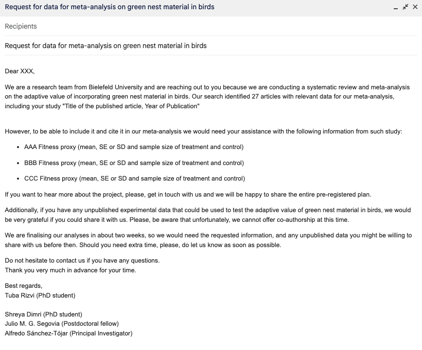 We contacted four corresponding authors to obtain missing data (e.g., non-reported results, missing sample sizes). All four authors responded to our email, but only two provided the data as requested; one did not have the data any more, and one did not give a conclusive response. Additionally, to locate grey literature (e.g., unpublished data), we wrote to the corresponding author(s) of all the 22 articles that passed full-text screening to ask for any potential unpublished data that could be included in our meta-analysis using a standardised email template (Figure S6). One author provided data for an unpublished study on blue tits (see description in Figure S7), and one of us (MO) provided data for an unpublished study on common buzzards (Buteo buteo).