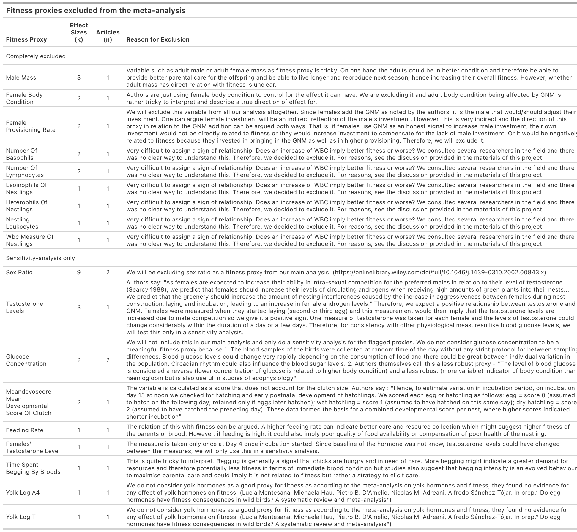 For each study, we also extracted information related to the study subjects (bird species, geographical location of the study population), the methodology of the study (fitness proxy measured) and the source from which we extracted data (e.g., figures, tables, raw data files, supplementary materials). We categorised the fitness proxies measured into 6 broad categories: physiology, morphology, reproduction, behaviour, parasite and pathogenic load, and phenology. For studies testing whether GNM affects the number of parasites or pathogens found in offspring and/or nests, we categorised them into arthropods or microorganisms. For a complete list of variables extracted, see Figure S8 . During data extraction, we encountered some traits (e.g., WBC ratio, parent mass; 15 effect sizes, n = 5 studies) that we did not include in any of our analyses because it was unclear from the study and our own judgement how these traits related to fitness (see Figure S5 for the list and reasons of exclusion).