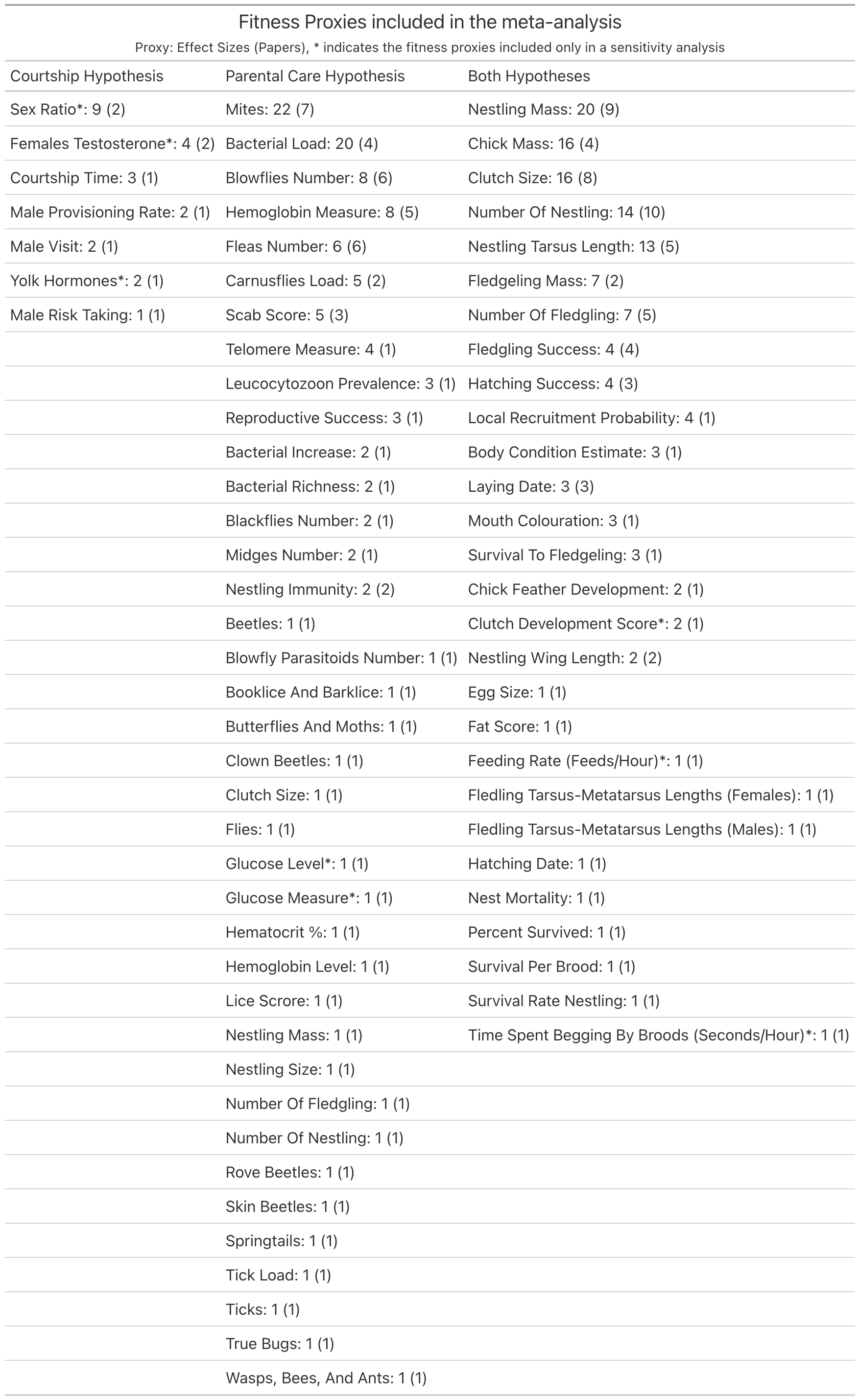 We thank Klaus Reinhold for his support. We also thank all the authors who replied to our emails and who addressed our questions. We are particularly grateful to those who kindly shared their data: Adele Mennerat, Dave Shutler and Gustavo Tomás Gutiérrez.