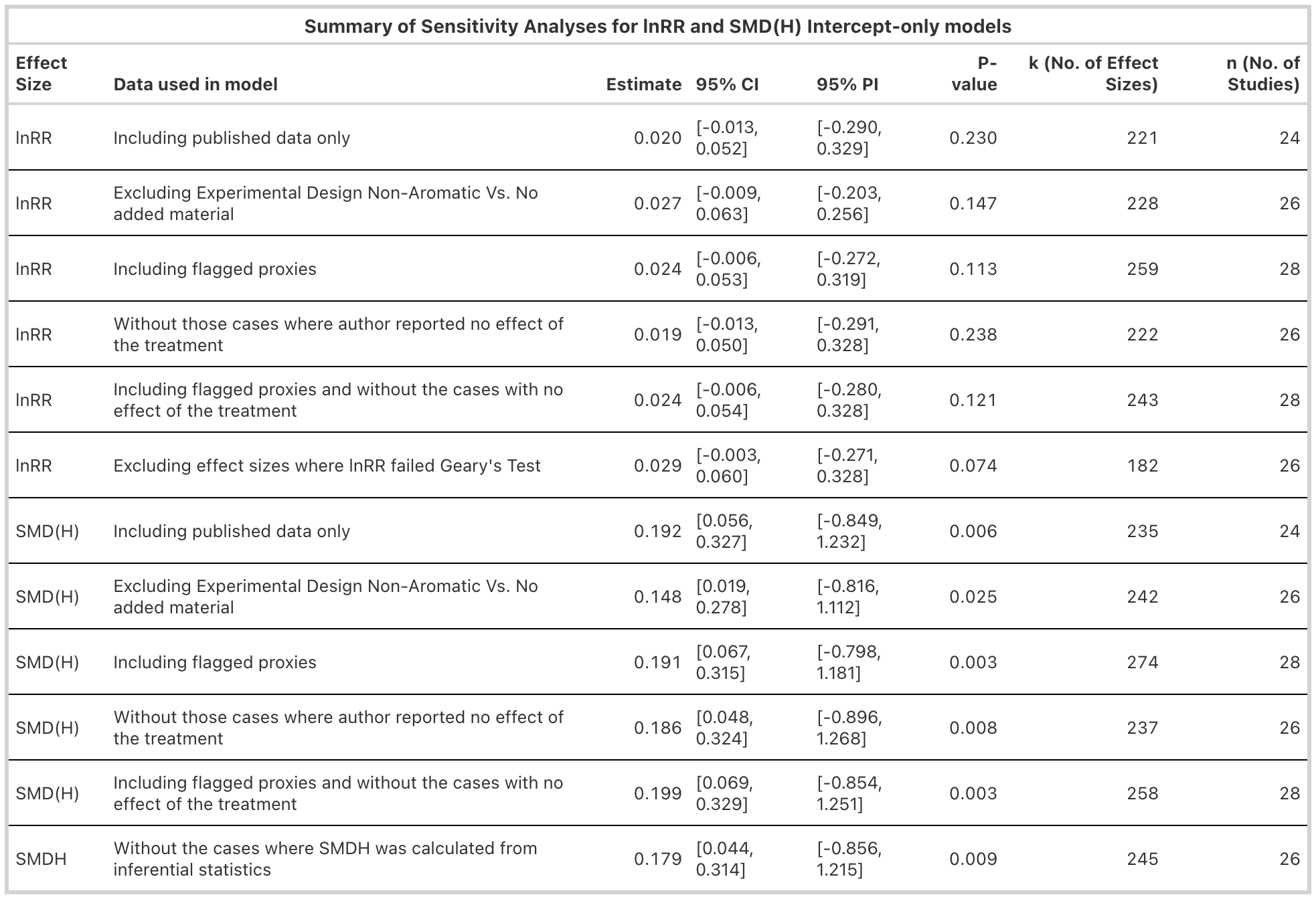 The overall results and their conclusions were robust to several sensitivity analyses. First, we fitted a pre-registered bivariate multilevel meta-analytic model including both effect sizes as response variables (lnRR = -0.015, p-value = 0.624 and SMD(H) = 0.250 , p-value = 0.069). In addition, we ran several sensitivity analyses to test the robustness of the overall results to the: (i) inclusion of traits for which their relationship with fitness was debated in the literature (non-pre-registered); (ii) removal of effect sizes that were originally reported as simply statistically non-significant and we assumed them to be zero (non-pre-registered); (iii) both (i) and (ii) (non-pre-registered); (iv) removal of effect sizes from non-aromatic vs. aromatic experimental design (non-pre-registered); (v) removal of effect sizes from non-aromatic vs. no added material experimental design (non-pre-registered); (vi) removal of effect sizes that were calculated by transforming inferential statistics (pre-registered); (vii) removal of effect sizes that failed the Geary’s Test for lnRR (non-pre-registered); (viii) removal of unpublished data (non-pre-registered); and (ix) use of different values of correlation (ρ) between sampling variance for variance-covariance matrix (pre-registered). The number of effect sizes included in those sensitivity analyses ranged from 182 to 274, and the conclusions remained largely the same Table S2.
