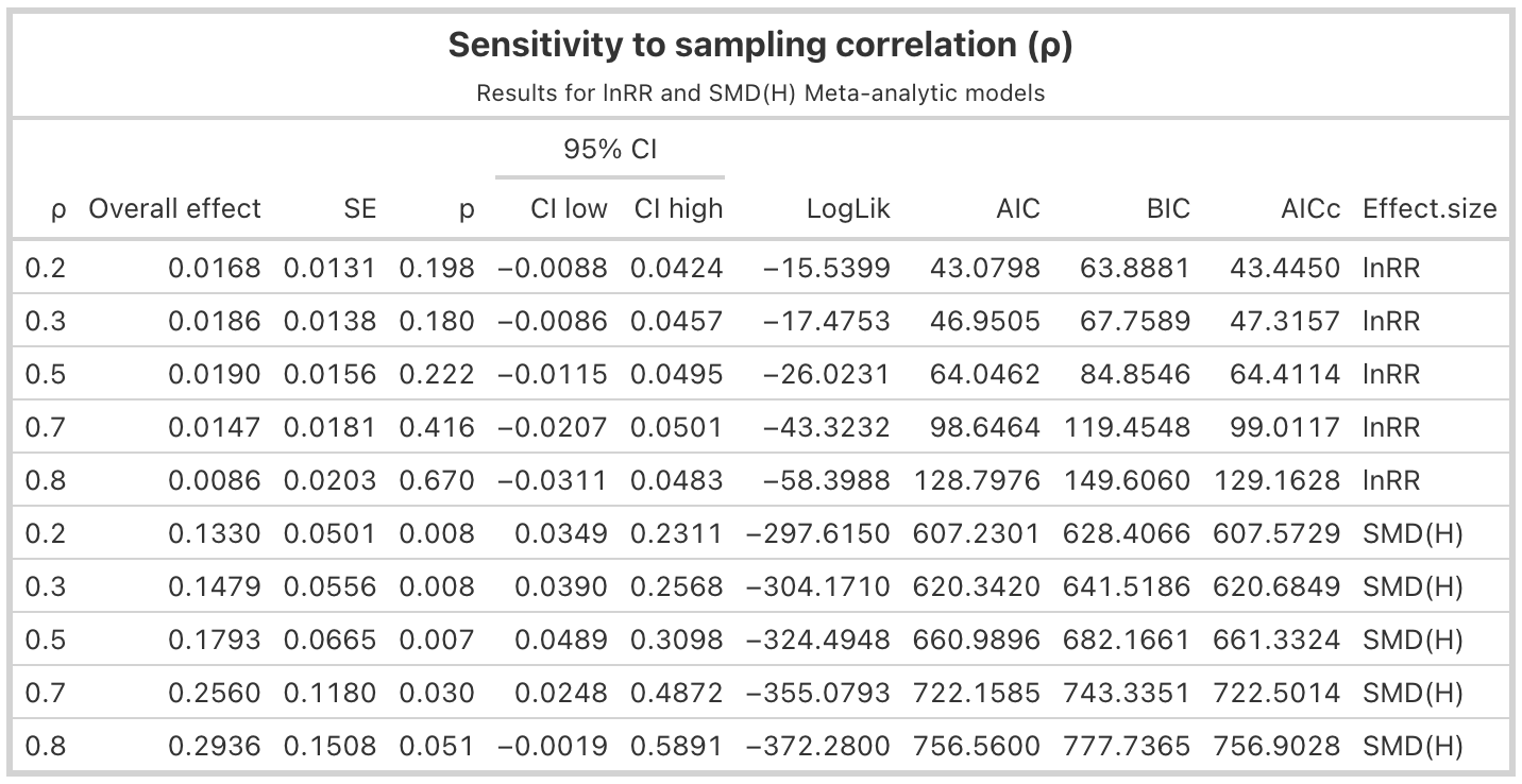Sensitivity analysis of sampling correlation values (ρ) in variance–covariance structures