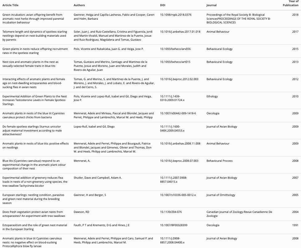 <TI=(((“green*” OR “herb*” OR “aromatic*”) AND “nest*” AND (“bird*” OR “aves” OR “avian” OR “ornithol*” OR “passerine*” OR “passeriform*” OR “songbird*” OR “Accipiter” OR “Aegypius” OR “Aquila” OR “Aviceda” OR “Busarellus” OR “Butastur” OR “Buteo” OR “Buteogallus” OR “Chondrohierax” OR “Circaetus” OR “Circus” OR “Clanga” OR “Elanoides” OR “Elanus” OR “Gampsonyx” OR “Geranoaetus” OR “Geranospiza” OR “Gypaetus” OR “Gypohierax” OR “Gyps” OR “Haliaeetus” OR “Haliastur” OR “Harpagus” OR “Harpia” OR “Hieraaetus” OR “Ictinaetus” OR “Ictinia” OR “Kaupifalco” OR “Leptodon” OR “Leucopternis” OR “Lophotriorchis” OR “Milvus” OR “Morphnarchus” OR “Morphnus” OR “Necrosyrtes” OR “Neophron” OR “Nisaetus” OR “Parabuteo” OR “Pernis” OR “Pithecophaga” OR “Polemaetus” OR “Pseudastur” OR “Rostrhamus” OR “Rupornis” OR “Sarcogyps” OR “Spilornis” OR “Spizaetus” OR “Stephanoaetus” OR “Terathopius” OR “Torgos” OR “Trigonoceps” OR “Cathartes” OR “Coragyps” OR “Gymnogyps” OR “Sarcoramphus” OR “Vultur” OR “Pandion” OR “Sagittarius” OR “Aix” OR “Alopochen” OR “Amazonetta” OR “Anas” OR “Anser” OR “Asarcornis” OR “Aythya” OR “Branta” OR “Bucephala” OR “Cairina” OR “Callonetta” OR “Cereopsis” OR “Chen” OR “Chenonetta” OR “Chloephaga” OR “Clangula” OR “Coscoroba” OR “Cyanochen” OR “Cygnus” OR”Dendrocygna” OR “Heteronetta” OR “Histrionicus” OR “Hymenolaimus” OR “Lophodytes” OR “Lophonetta” OR “Malacorhynchus” OR “Mareca” OR “Marmaronetta” OR “Melanitta” OR “Merganetta” OR “Mergellus” OR “Mergus” OR “Neochen” OR “Netta” OR “Nettapus” OR “Nomonyx” OR “Oxyura” OR “Plectropterus” OR “Polysticta” OR “Pteronetta” OR “Sarkidiornis” OR “Sibirionetta” OR “Somateria” OR “Spatula” OR “Tachyeres” OR “Tadorna” OR “Thalassornis” OR “Anhima” OR “Chauna” OR “Anseranas” OR “Aegotheles” OR “Aerodramus” OR “Aeronautes” OR “Apus” OR “Chaetura” OR “Collocalia” OR “Cypseloides” OR “Cypsiurus” OR “Hirundapus” OR “Panyptila” OR “Streptoprocne” OR “Tachornis” OR “Tachymarptis” OR “Hemiprocne” OR “Abeillia” OR “Adelomyia” OR “Aglaeactis” OR “Aglaiocercus” OR “Amazilia” OR “Androdon” OR “Anopetia” OR “Anthocephala” OR “Anthracothorax” OR “Archilochus” OR “Atthis” OR “Augastes” OR “Avocettula” OR “Basilinna” OR “Boissonneaua” OR “Calliphlox” OR “Calypte” OR “Campylopterus” OR “Chaetocercus” OR “Chalcostigma” OR “Chalybura” OR “Chlorestes” OR “Chlorostilbon” OR “Chrysolampis” OR “Chrysuronia” OR “Clytolaema” OR “Coeligena” OR “Colibri” OR “Cyanophaia” OR “Cynanthus” OR “Discosura” OR “Doricha” OR “Doryfera” OR “Elvira” OR “Ensifera” OR “Eriocnemis” OR “Eugenes” OR “Eulampis” OR “Eulidia” OR “Eupetomena” OR “Eupherusa” OR “Eutoxeres” OR “Florisuga” OR “Glaucis” OR “Goethalsia” OR “Goldmania” OR “Haplophaedia” OR “Heliactin” OR “Heliangelus” OR “Heliodoxa” OR “Heliomaster” OR “Heliothryx” OR “Hylocharis” OR “Juliamyia” OR “Klais” OR “Lafresnaya” OR “Lampornis” OR “Lamprolaima” OR “Lepidopyga” OR “Lesbia” OR “Leucippus” OR “Leucochloris” OR “Lophornis” OR “Mellisuga” OR “Metallura” OR “Microchera” OR “Myrmia” OR “Myrtis” OR “Ocreatus” OR “Opisthoprora” OR “Oreonympha” OR “Oreotrochilus” OR “Orthorhyncus” OR “Oxypogon” OR “Panterpe” OR “Patagona” OR “Phaeochroa” OR “Phaethornis” OR “Phlogophilus” OR “Polyonymus” OR “Polytmus” OR “Pterophanes” OR “Ramphodon” OR “Ramphomicron” OR “Rhodopis” OR “Sappho” OR “Schistes” OR “Selasphorus” OR “Sephanoides” OR “Stephanoxis” OR “Sternoclyta” OR “Taphrospilus” OR “Thalurania” OR “Thaumastura” OR “Threnetes” OR “Topaza” OR “Trochilus” OR “Urochroa” OR “Urosticte” OR “Apteryx” OR “Anthracoceros” OR “Buceros” OR “Bycanistes” OR “Lophoceros” OR “Penelopides” OR “Rhabdotorrhinus” OR “Rhyticeros” OR “Tockus” OR “Bucorvus” OR “Phoeniculus” OR “Rhinopomastus” OR “Upupa” OR “Antrostomus” OR “Caprimulgus” OR “Chordeiles” OR “Eleothreptus” OR “Eurostopodus” OR “Hydropsalis” OR “Lurocalis” OR “Lyncornis” OR “Nyctidromus” OR “Nyctiphrynus” OR “Nyctipolus” OR “Nyctiprogne” OR “Phalaenoptilus” OR “Setopagis” OR “Systellura” OR “Uropsalis” OR “Nyctibius” OR “Batrachostomus” OR “Podargus” OR “Steatornis” OR “Cariama” OR “Casuarius” OR “Dromaius” OR “Aethia” OR “Alca” OR “Alle” OR “Brachyramphus” OR “Cepphus” OR “Cerorhinca” OR “Fratercula” OR “Pinguinus” OR “Ptychoramphus” OR “Synthliboramphus” OR “Uria” OR “Burhinus” OR “Anarhynchus” OR “Charadrius” OR “Elseyornis” OR “Erythrogonys” OR “Hoploxypterus” OR “Oreopholus” OR “Peltohyas” OR “Phegornis” OR “Pluvialis” OR “Thinornis” OR “Vanellus” OR “Chionis” OR “Dromas” OR “Cursorius” OR “Glareola” OR “Rhinoptilus” OR “Stiltia” OR “Haematopus” OR “Actophilornis” OR “Hydrophasianus” OR “Irediparra” OR “Jacana” OR “Metopidius” OR “Microparra” OR “Anous” OR “Chlidonias” OR “Chroicocephalus” OR “Creagrus” OR “Gelochelidon” OR “Gygis” OR “Hydrocoloeus” OR “Hydroprogne”